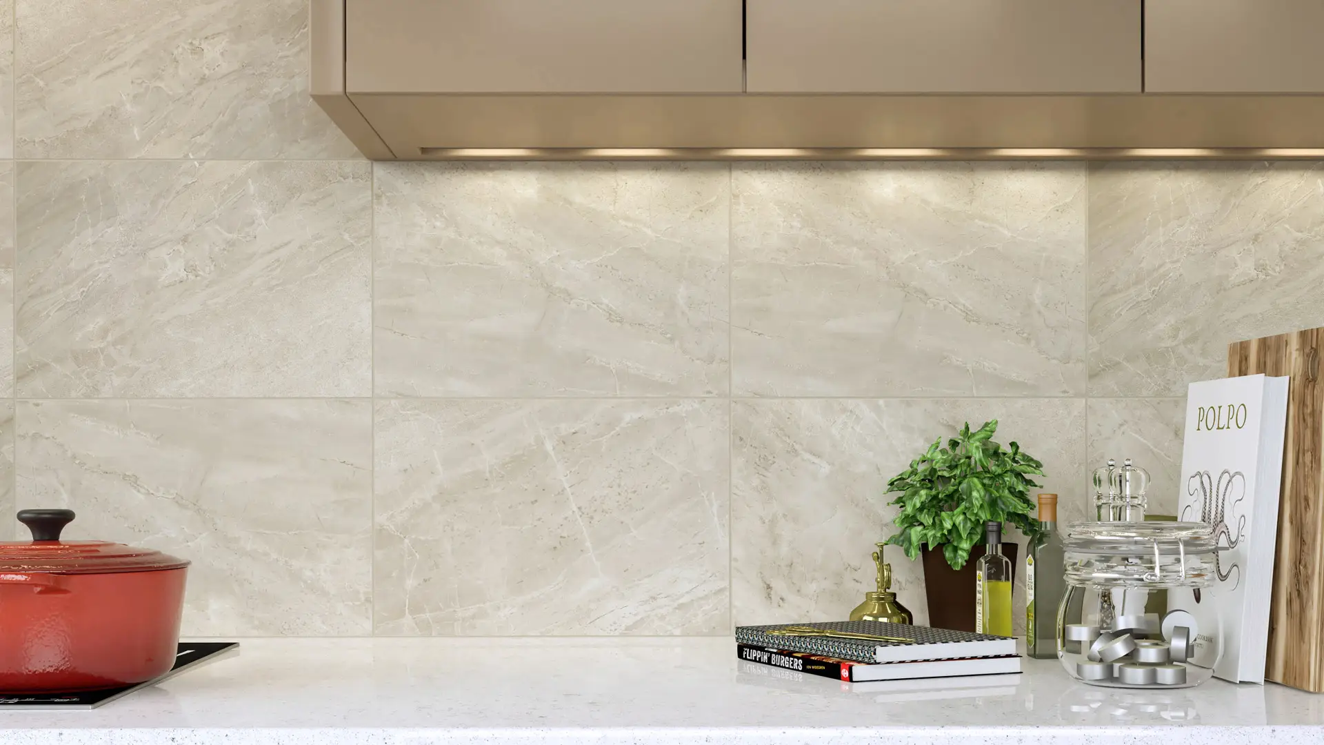 Muro cerámico con diseño tipo mármol ideal para aplicación interior.