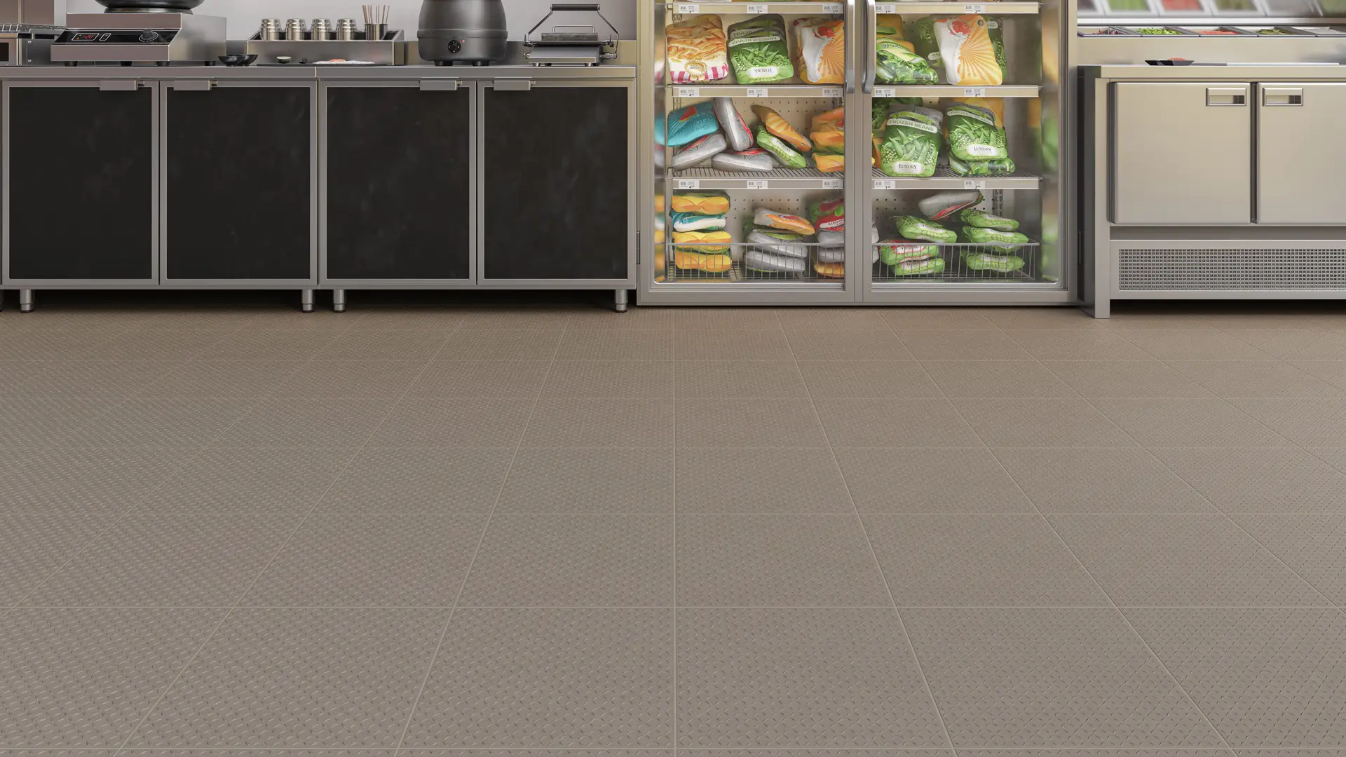 Piso cerámico tipo Quarry en formato 37cm x 37 cm, acabado mate, en color Rojo decorado sobre nueva superficie de estructura tipo Industrial ideal para área de cocina de cadenas comerciales gracias a su característica antiderrapante. Enfocado a uso Comercial, interior.