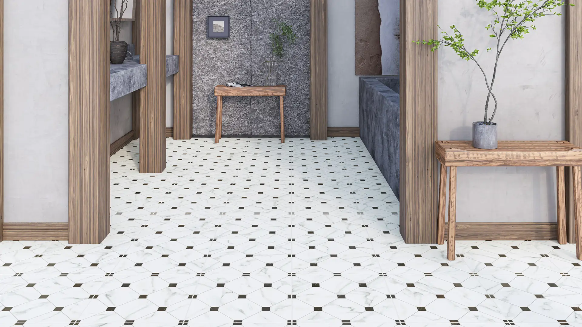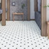 Piso cerámico tipo Mármol geométrico en formato 37×37 en acabado mate. Es un mármol tipo carrara que forma una sutil geometría acompañada de varios insertos en un color de contraste. También decorado con la nueva aplicación de Goma digital y granilla brillante, sincronizada con el diseño para crear el efecto de volumen. Ideal para cubrir espacios residenciales para interior con posibilidad de instalación exterior.