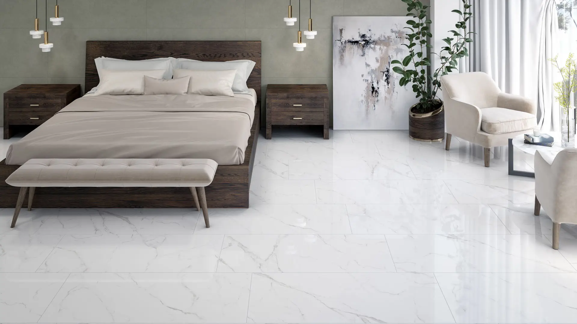 Diseño tipo carrara de intensidad suave y vetas tenues. Ideal para decoración residencial y comercian en aplicación interior